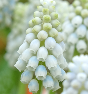 Alaska is a new award winning introduction which has captured the imagination of muscari enthusiasts because of its unusual coloring. The plants have densely compacted, pyramidal flowers of snow-white flushed with pale, ice-blue and topped with pale lime-green florets. They grow to a height of 6 inches, and bloom mid-season.
